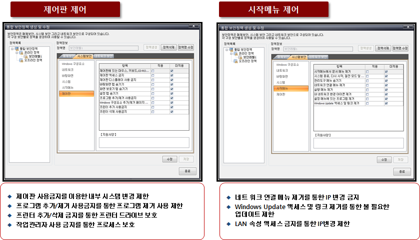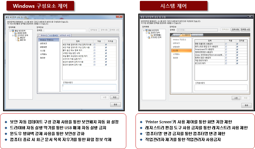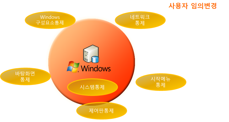 기업 내 컴퓨터의 활용 목적 이외의 작업을 할 수 없게 하는 통제 정책을 설정 할 수 있습니다. 관리자는 정책 설정을 통해 그룹별, 컴퓨터 별로 Windows 시스템에서 일반 사용자가 사용할 수 있는 기능에 대해 제어를 통해 사용자가 임의로 Windows 시스템에 대한 변경을 제어 할 수 있도록 합니다.