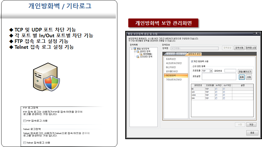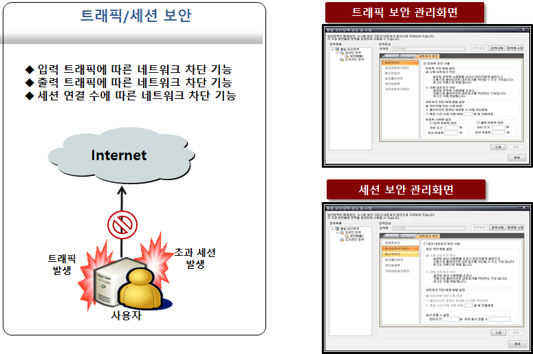네트워크가 활성 되어 외부 및 내부에 대한 다양한 인터넷 작업을 사용자가 진행하는 과정에서 내부 정보가 외부로 유출될 수 있습니다. 관리자는 네트워크 보안을 이용하여 인터넷 보안, 메일보안, 트래픽 보안, 세션네트워크 보안, 메신저보안 개인방화벽보안 공유폴더 보안을 통해 사용자의 정보 유출 및 외부 침입에 대처할 수 있습니다.