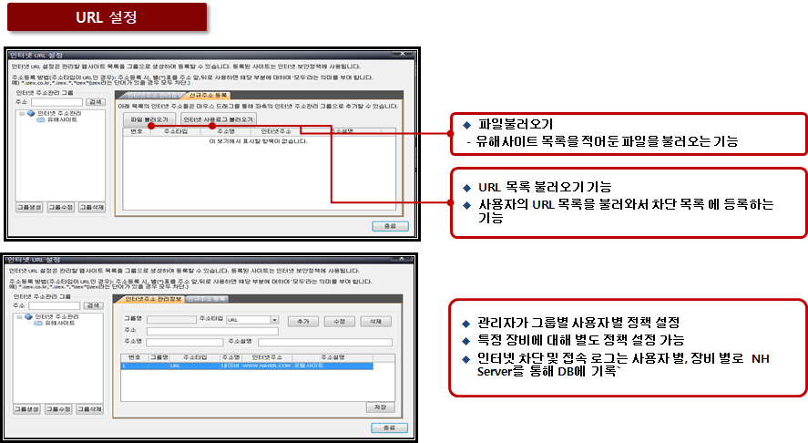 인터넷 정책은 사용자가 외부 인터넷 사이트에 접근을 허가하거나 차단하는 기능입니다. 보안정책에 의해 특정 사이트만 접속을 허용 할 수 있으며, 반대로 특정 사이트만 접속을 불가능 하게 하여 사용자들이 불필요한 사이트에 접근하지 못하도록 할 수 있는 것 뿐만 아니라 사용이력을 조회하여 감시가 가능합니다.