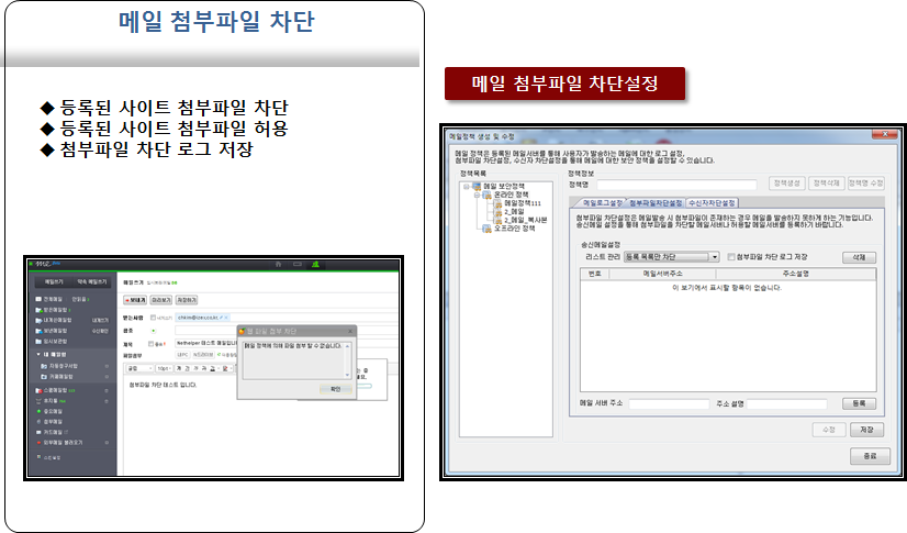 메일 정책을 통해 관리자는 관리자는 컴퓨터에서 발송되는 각종 메일에 대한 모니터링을 하며 메일 발송시 첨부파일에 대한 부분을 관리자의 정책에 의하여 차단 하고 원본을 저장을 가능하게 하여 메일로 발송되는 내용이나 문서에 대하여 유출을 방지&추적이 가능합니다.