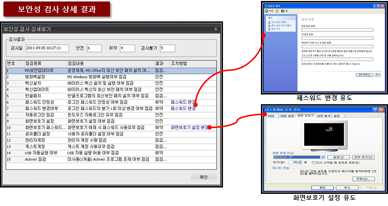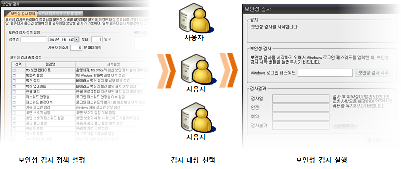 보안성 검사를 통해 사용자 컴퓨터의 취약점을 파악할 수 있는 기능입니다. 관리자는 보안성 검사를 진행할 종류를 선택하여, 정책을 실행할 수 있습니다. 실행된 결과는 자동으로 취합되어 안정성 유무를 파악 할 수 있습니다.