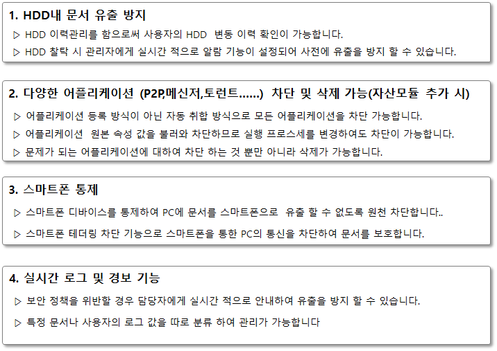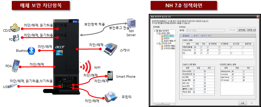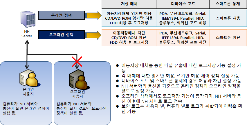 OFF Line 경로 중 가장 손쉽게 문서유출이 가능한 보조기억장치 (USB/ CD-ROM등)를 무분별하게 사용하여 통제가 힘든 상태였으나 NH의 도입으로 차단 및 사용이력 파악이 가능하여 관리가 가능합니다.