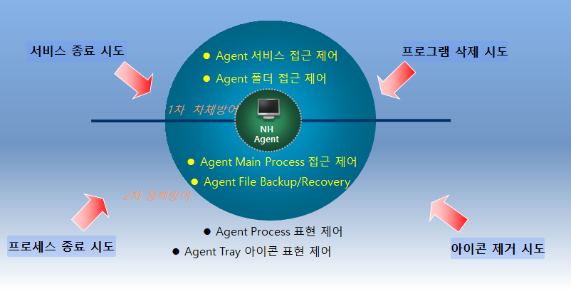 NH Agent는 일반 사용자가 의도적으로 NH Agent를 종료를 시도하거나 강제로 NH Agent를 삭제하기 위해 시도하는 경우, 이를 방지하기 위한 기능을 자체적으로 동작하여 Agent를 보호 하게 되어 있습니다. 일부 NH Agent 옵션 중에 트레이 아이콘 표현 및 프로세스 표현은 관리자의 설정에 의해 동작합니다. 또한 NH Agent는 Windows 안전모드에서도 동일하게 동작합니다.