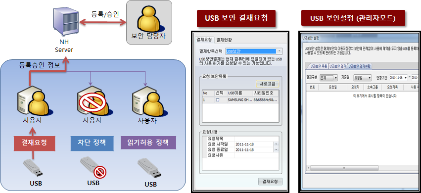 USB보안 기능을 이용해서 일반 USB에 대한 관리를 할 수 있습니다. 보안 정책으로 인해 모든 이동저장 장치를 차단하거나 읽기권한 만 있는 경우 USB 보안을 이용하여 관리자가 등록하거나 승인된 USB에 대해서 사용이 가능 합니다.