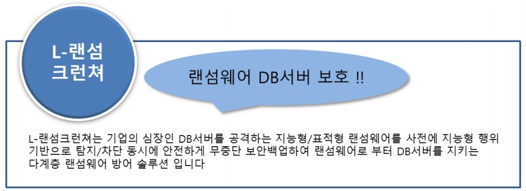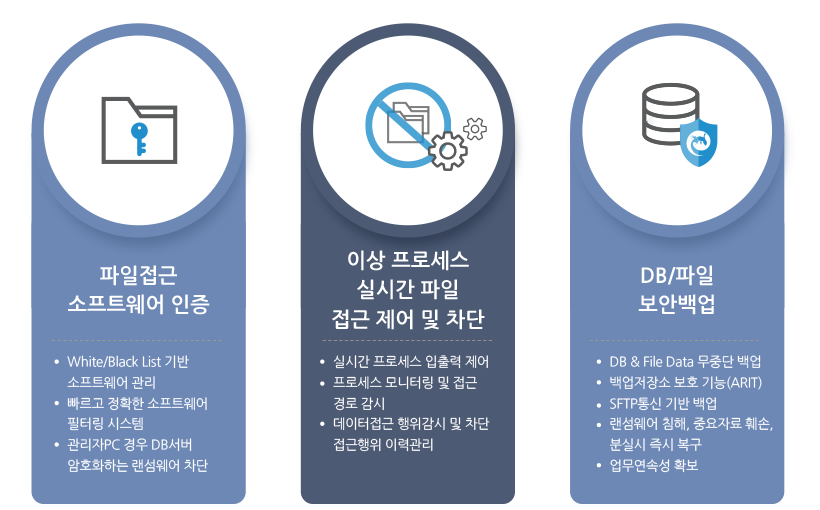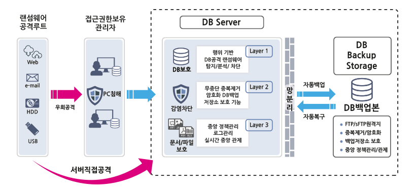 인터넷과 이메일 첨부파일을 통해 DB서버를 직접 공격하거나 서버 관리자PC를 경유하여 공격하는 지능화된 랜섬웨어를 3단계 다계층 방어(행위기반 사전 차단, 무중단 DB보안백업, 실시간 중앙관제)로 DB서버를 완벽하게 보호합니다.